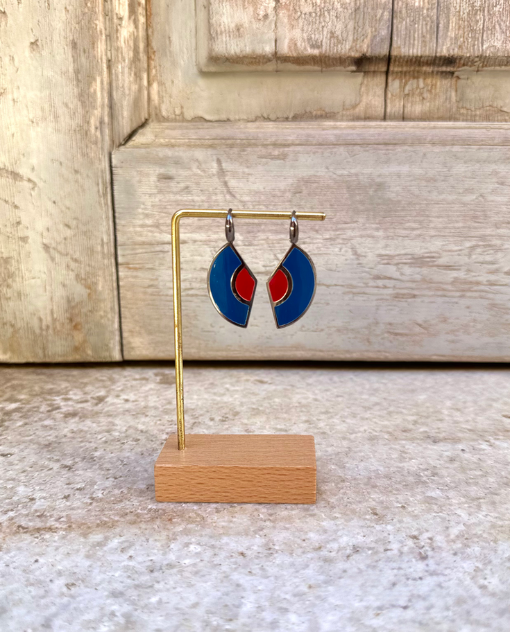 Black ruthenium plated sterling silver 925 earrings, crafted in an elegant, contemporary silhouette. Deep blue and vivid red enamel contrast beautifully with the black metal, in a color harmony inspired by the effortless allure of ancient Egypt. A gentle curve rests gracefully on the body, moving with you and offering a timeless sense of sophistication.