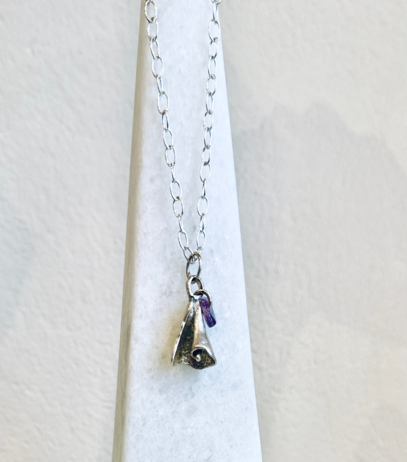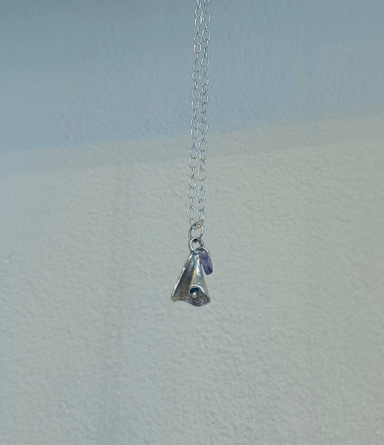 The Nerina necklace is crafted from 925 sterling silver and a soft violet amethyst. Inspired by the sea’s natural treasures, this handcrafted design evokes purity, femininity, and quiet elegance.